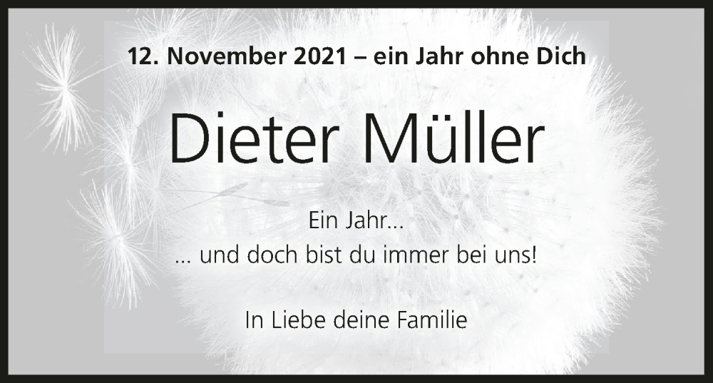 Hier finden Sie alle Traueranzeigen aus der Zeitung, die bisher für Dieter Müller erschienen sind. Weitere Traueranzeigen, die in der Zeitung erscheinen, werden hier ebenfalls aufgelistet