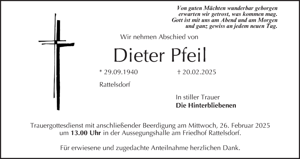 Hier finden Sie alle Traueranzeigen aus der Zeitung, die bisher für Dieter Pfeil erschienen sind. Weitere Traueranzeigen, die in der Zeitung erscheinen, werden hier ebenfalls aufgelistet