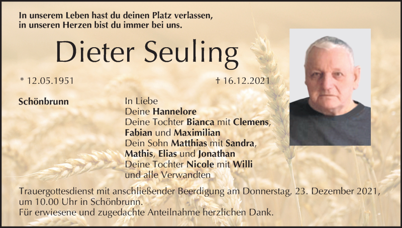 Hier finden Sie alle Traueranzeigen aus der Zeitung, die bisher für Dieter Seuling erschienen sind. Weitere Traueranzeigen, die in der Zeitung erscheinen, werden hier ebenfalls aufgelistet