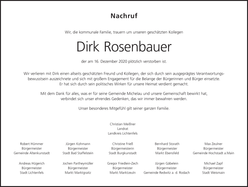 Hier finden Sie alle Traueranzeigen aus der Zeitung, die bisher für Dirk Rosenbauer erschienen sind. Weitere Traueranzeigen, die in der Zeitung erscheinen, werden hier ebenfalls aufgelistet