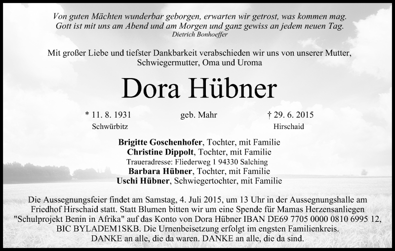 Hier finden Sie alle Traueranzeigen aus der Zeitung, die bisher für Dora Hübner erschienen sind. Weitere Traueranzeigen, die in der Zeitung erscheinen, werden hier ebenfalls aufgelistet
