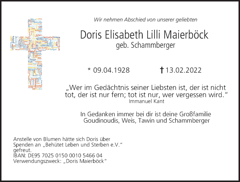 Hier finden Sie alle Traueranzeigen aus der Zeitung, die bisher für Doris Elisabeth Lilli Maierböck erschienen sind. Weitere Traueranzeigen, die in der Zeitung erscheinen, werden hier ebenfalls aufgelistet