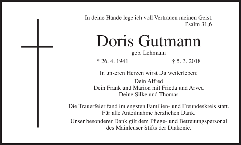 Hier finden Sie alle Traueranzeigen aus der Zeitung, die bisher für Doris Gutmann erschienen sind. Weitere Traueranzeigen, die in der Zeitung erscheinen, werden hier ebenfalls aufgelistet