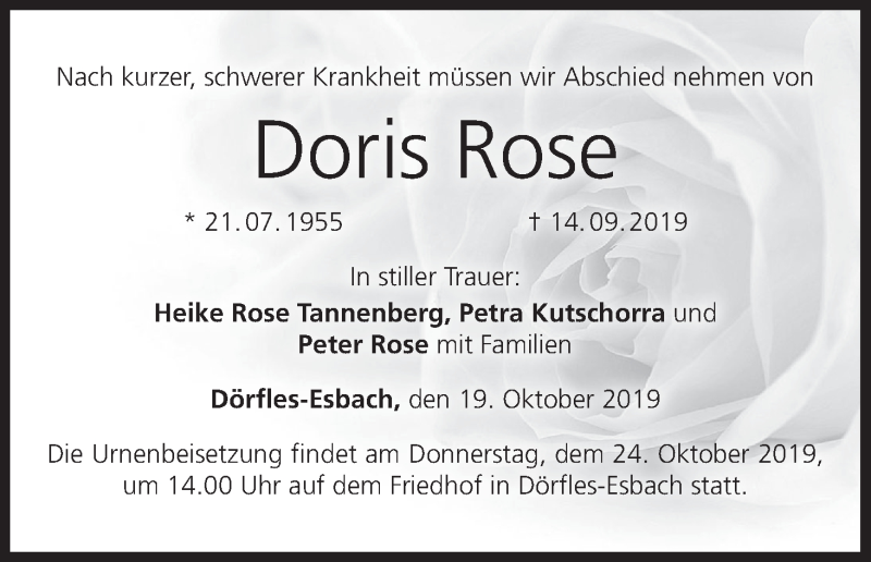 Hier finden Sie alle Traueranzeigen aus der Zeitung, die bisher für Doris Rose erschienen sind. Weitere Traueranzeigen, die in der Zeitung erscheinen, werden hier ebenfalls aufgelistet