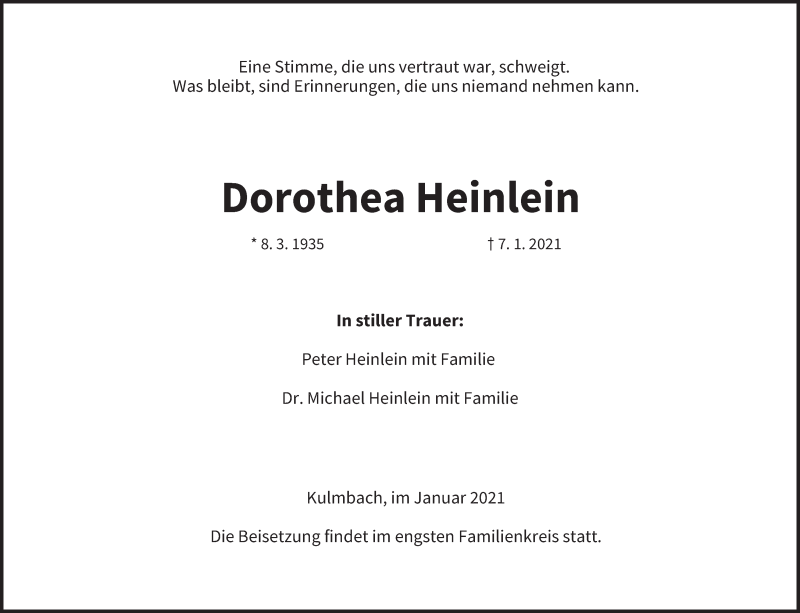 Hier finden Sie alle Traueranzeigen aus der Zeitung, die bisher für Dorothea Heinlein erschienen sind. Weitere Traueranzeigen, die in der Zeitung erscheinen, werden hier ebenfalls aufgelistet