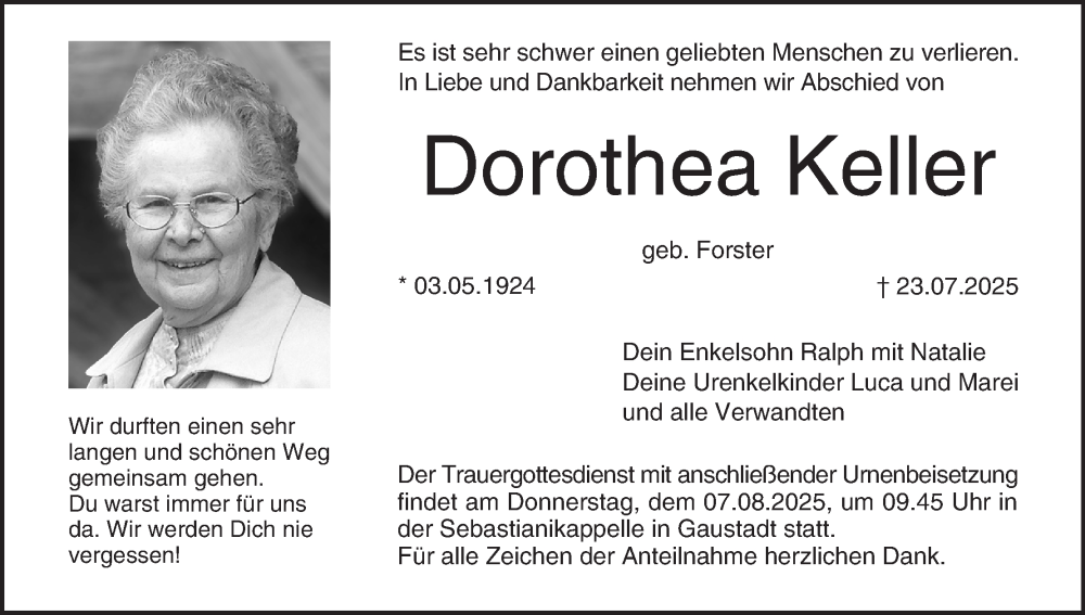 Hier finden Sie alle Traueranzeigen aus der Zeitung, die bisher für Dorothea Keller erschienen sind. Weitere Traueranzeigen, die in der Zeitung erscheinen, werden hier ebenfalls aufgelistet