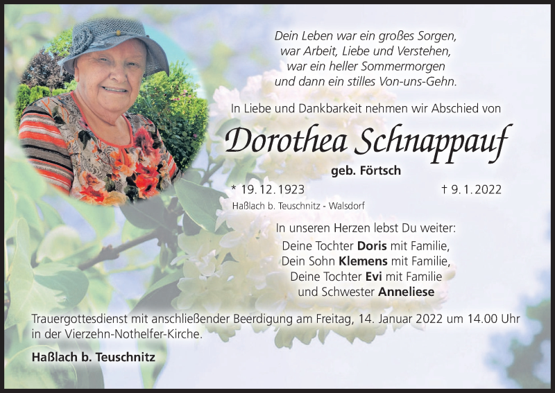 Hier finden Sie alle Traueranzeigen aus der Zeitung, die bisher für Dorothea Schnappauf erschienen sind. Weitere Traueranzeigen, die in der Zeitung erscheinen, werden hier ebenfalls aufgelistet