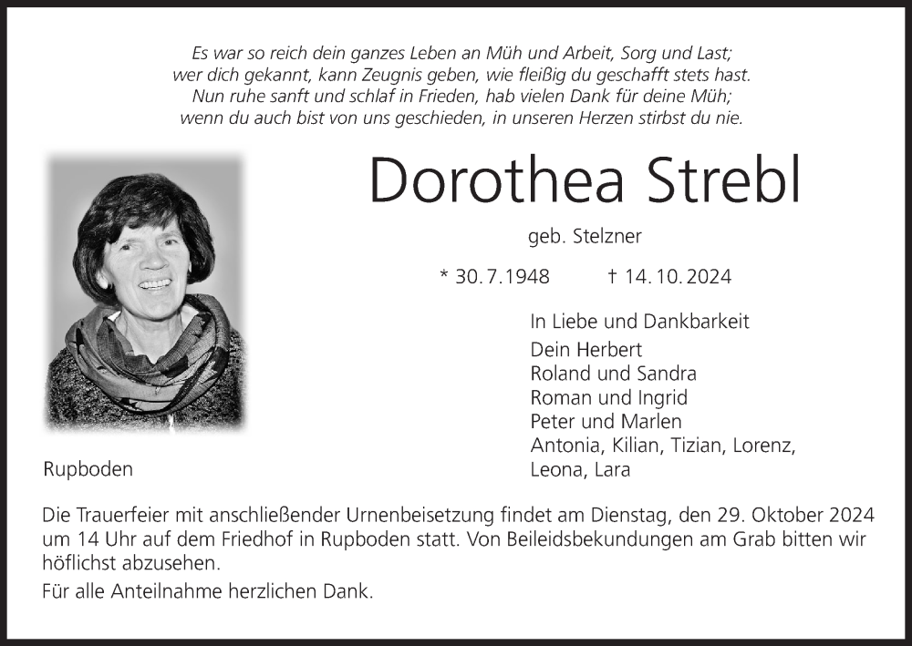 Hier finden Sie alle Traueranzeigen aus der Zeitung, die bisher für Dorothea Strebl erschienen sind. Weitere Traueranzeigen, die in der Zeitung erscheinen, werden hier ebenfalls aufgelistet