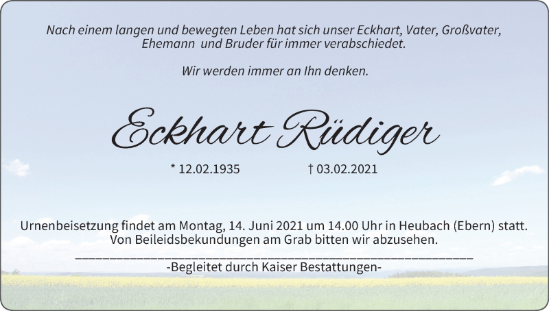 Hier finden Sie alle Traueranzeigen aus der Zeitung, die bisher für Eckhart Rüdiger erschienen sind. Weitere Traueranzeigen, die in der Zeitung erscheinen, werden hier ebenfalls aufgelistet