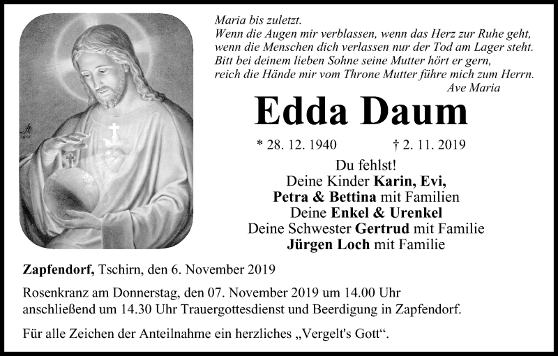 Hier finden Sie alle Traueranzeigen aus der Zeitung, die bisher für Edda Daum erschienen sind. Weitere Traueranzeigen, die in der Zeitung erscheinen, werden hier ebenfalls aufgelistet