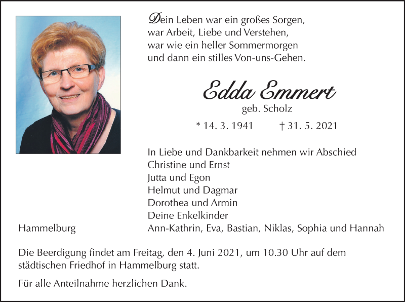 Hier finden Sie alle Traueranzeigen aus der Zeitung, die bisher für Edda Emmert erschienen sind. Weitere Traueranzeigen, die in der Zeitung erscheinen, werden hier ebenfalls aufgelistet