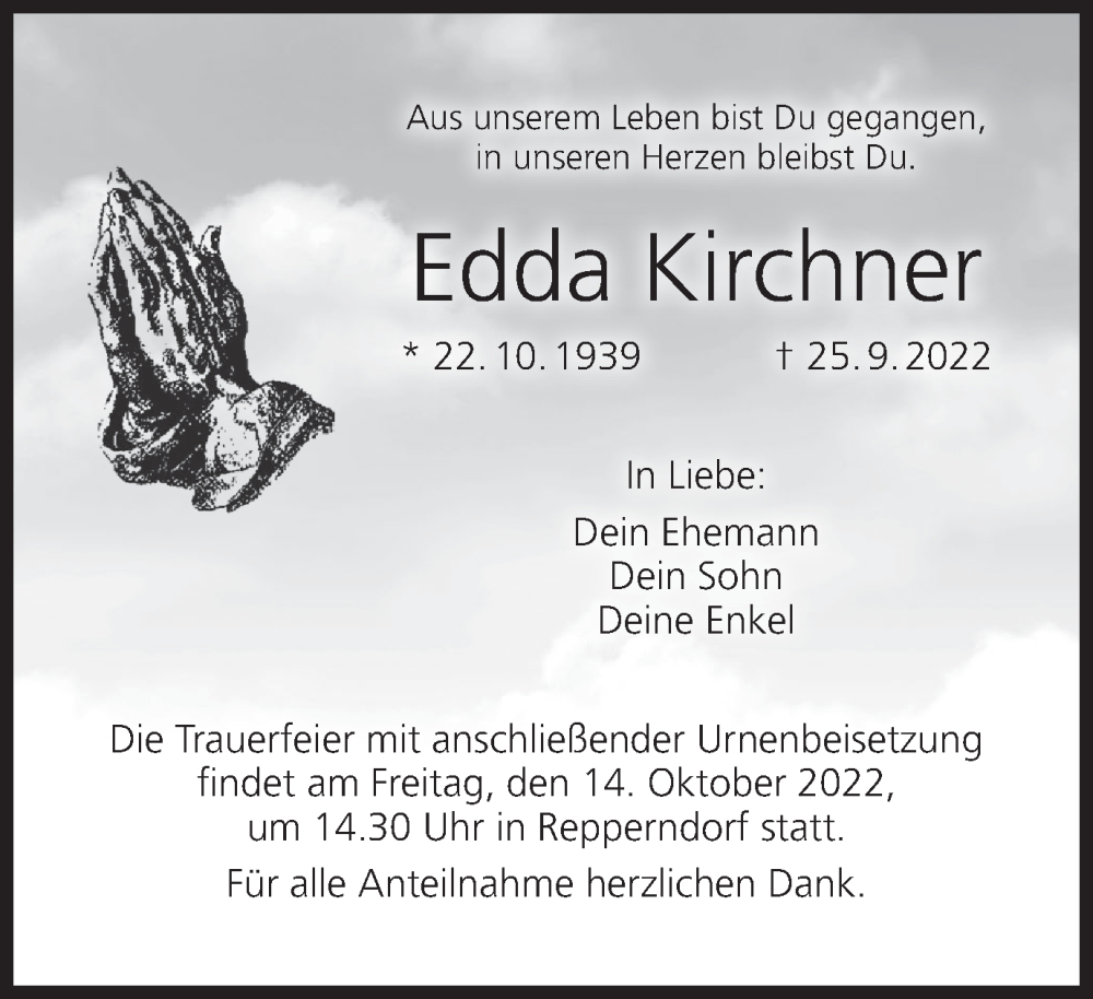 Hier finden Sie alle Traueranzeigen aus der Zeitung, die bisher für Edda Kirchner erschienen sind. Weitere Traueranzeigen, die in der Zeitung erscheinen, werden hier ebenfalls aufgelistet
