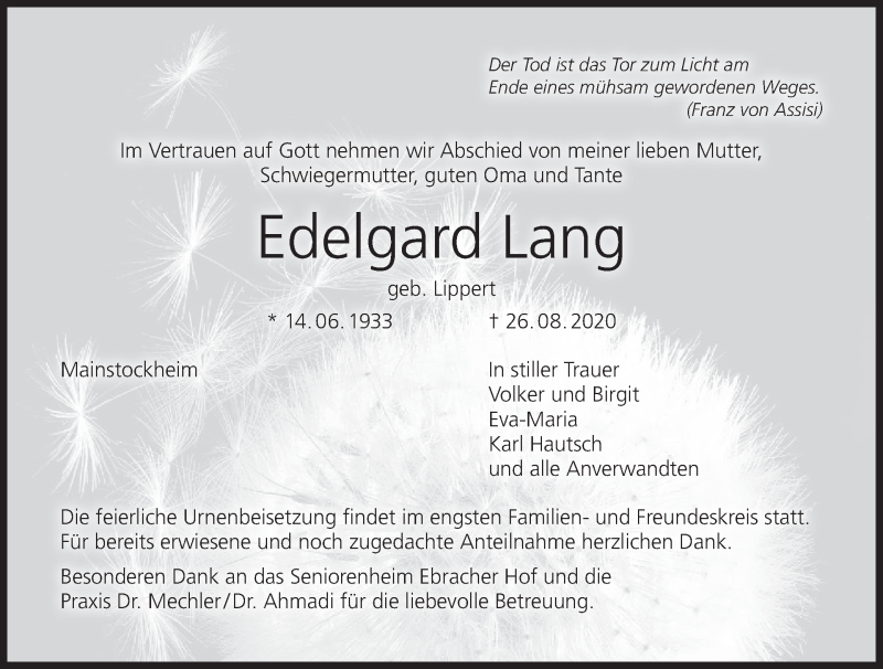 Hier finden Sie alle Traueranzeigen aus der Zeitung, die bisher für Edelgard Lang erschienen sind. Weitere Traueranzeigen, die in der Zeitung erscheinen, werden hier ebenfalls aufgelistet