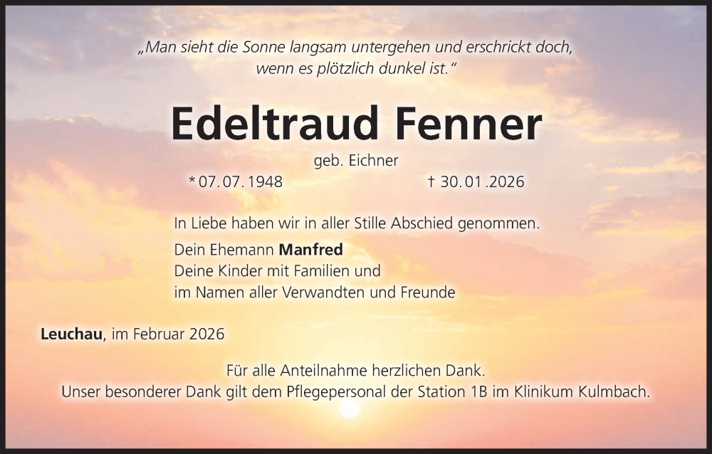 Hier finden Sie alle Traueranzeigen aus der Zeitung, die bisher für Edeltraud Fenner erschienen sind. Weitere Traueranzeigen, die in der Zeitung erscheinen, werden hier ebenfalls aufgelistet