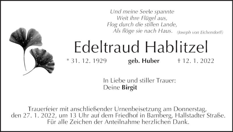 Hier finden Sie alle Traueranzeigen aus der Zeitung, die bisher für Edeltraud Hablitzel erschienen sind. Weitere Traueranzeigen, die in der Zeitung erscheinen, werden hier ebenfalls aufgelistet