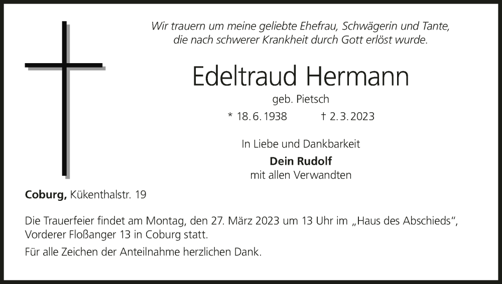 Hier finden Sie alle Traueranzeigen aus der Zeitung, die bisher für Edeltraud Hermann erschienen sind. Weitere Traueranzeigen, die in der Zeitung erscheinen, werden hier ebenfalls aufgelistet