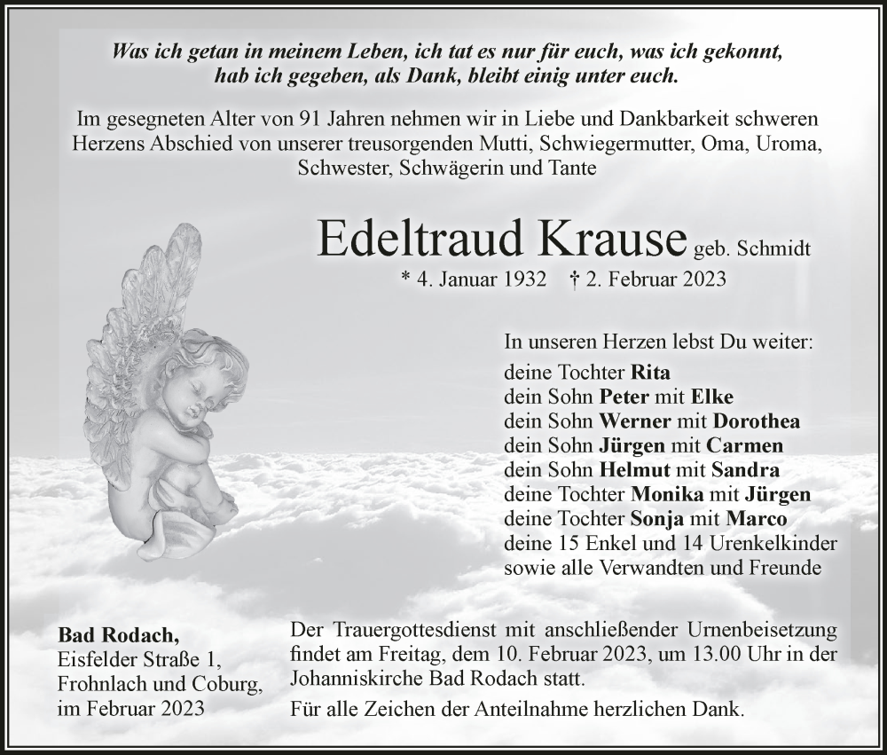 Hier finden Sie alle Traueranzeigen aus der Zeitung, die bisher für Edeltraud Krause erschienen sind. Weitere Traueranzeigen, die in der Zeitung erscheinen, werden hier ebenfalls aufgelistet