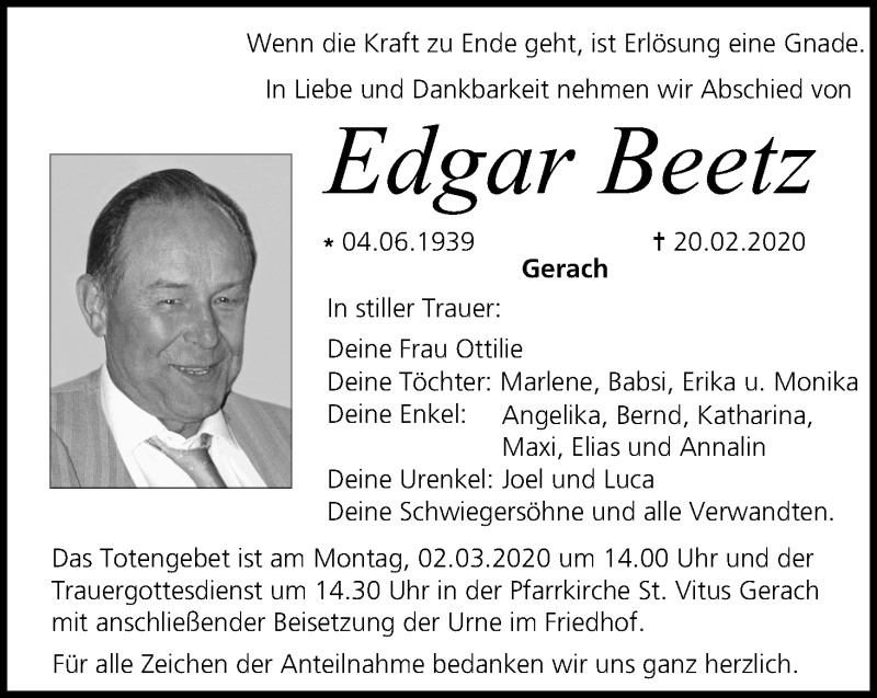 Hier finden Sie alle Traueranzeigen aus der Zeitung, die bisher für Edgar Beetz erschienen sind. Weitere Traueranzeigen, die in der Zeitung erscheinen, werden hier ebenfalls aufgelistet