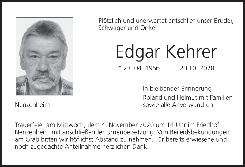 Hier finden Sie alle Traueranzeigen aus der Zeitung, die bisher für Edgar Kehrer erschienen sind. Weitere Traueranzeigen, die in der Zeitung erscheinen, werden hier ebenfalls aufgelistet
