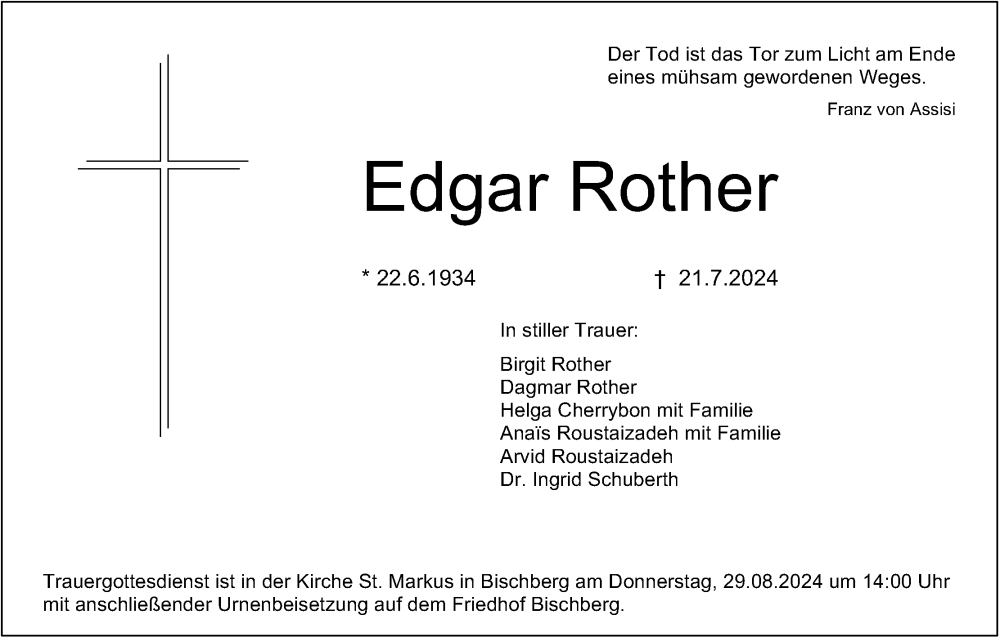 Hier finden Sie alle Traueranzeigen aus der Zeitung, die bisher für Edgar Rother erschienen sind. Weitere Traueranzeigen, die in der Zeitung erscheinen, werden hier ebenfalls aufgelistet