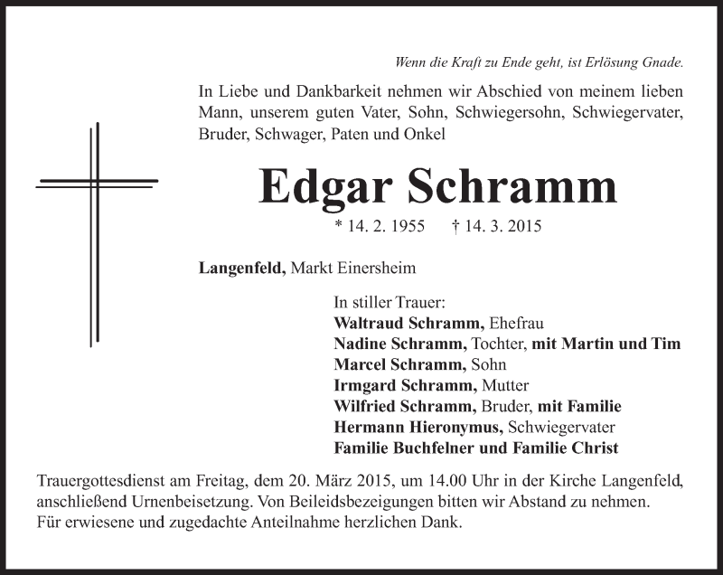 Hier finden Sie alle Traueranzeigen aus der Zeitung, die bisher für Edgar Schramm erschienen sind. Weitere Traueranzeigen, die in der Zeitung erscheinen, werden hier ebenfalls aufgelistet