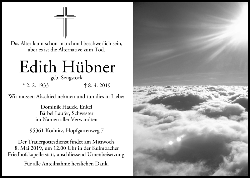 Hier finden Sie alle Traueranzeigen aus der Zeitung, die bisher für Edith Hübner erschienen sind. Weitere Traueranzeigen, die in der Zeitung erscheinen, werden hier ebenfalls aufgelistet