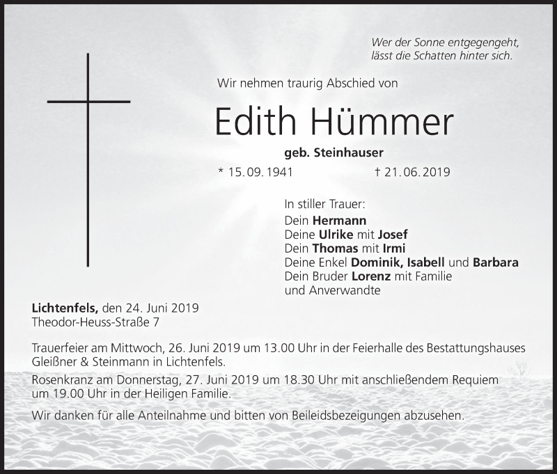 Hier finden Sie alle Traueranzeigen aus der Zeitung, die bisher für Edith Hümmer erschienen sind. Weitere Traueranzeigen, die in der Zeitung erscheinen, werden hier ebenfalls aufgelistet