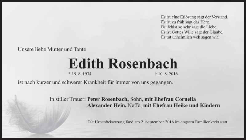 Hier finden Sie alle Traueranzeigen aus der Zeitung, die bisher für Edith Rosenbach erschienen sind. Weitere Traueranzeigen, die in der Zeitung erscheinen, werden hier ebenfalls aufgelistet