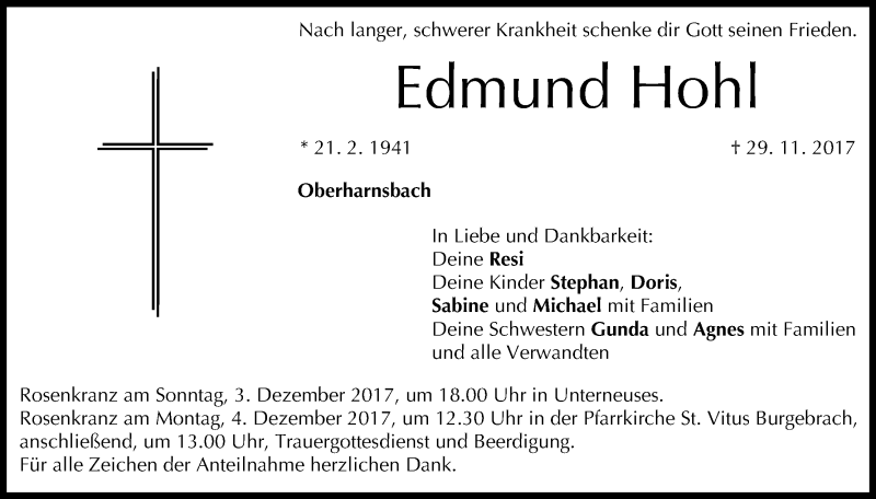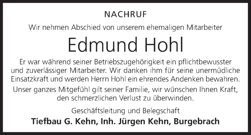 Hier finden Sie alle Traueranzeigen aus der Zeitung, die bisher für Edmund Hohl erschienen sind. Weitere Traueranzeigen, die in der Zeitung erscheinen, werden hier ebenfalls aufgelistet
