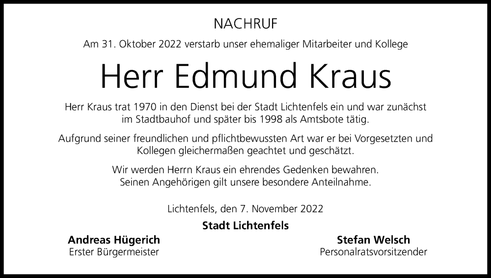 Hier finden Sie alle Traueranzeigen aus der Zeitung, die bisher für Edmund Kraus erschienen sind. Weitere Traueranzeigen, die in der Zeitung erscheinen, werden hier ebenfalls aufgelistet
