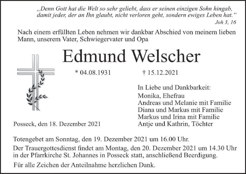 Hier finden Sie alle Traueranzeigen aus der Zeitung, die bisher für Edmund Welscher erschienen sind. Weitere Traueranzeigen, die in der Zeitung erscheinen, werden hier ebenfalls aufgelistet