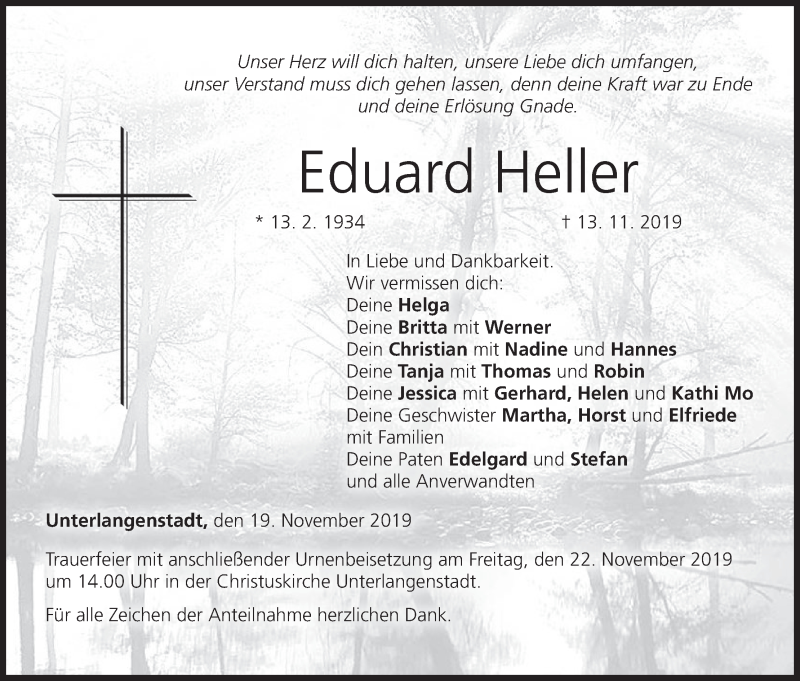 Hier finden Sie alle Traueranzeigen aus der Zeitung, die bisher für Eduard Heller erschienen sind. Weitere Traueranzeigen, die in der Zeitung erscheinen, werden hier ebenfalls aufgelistet