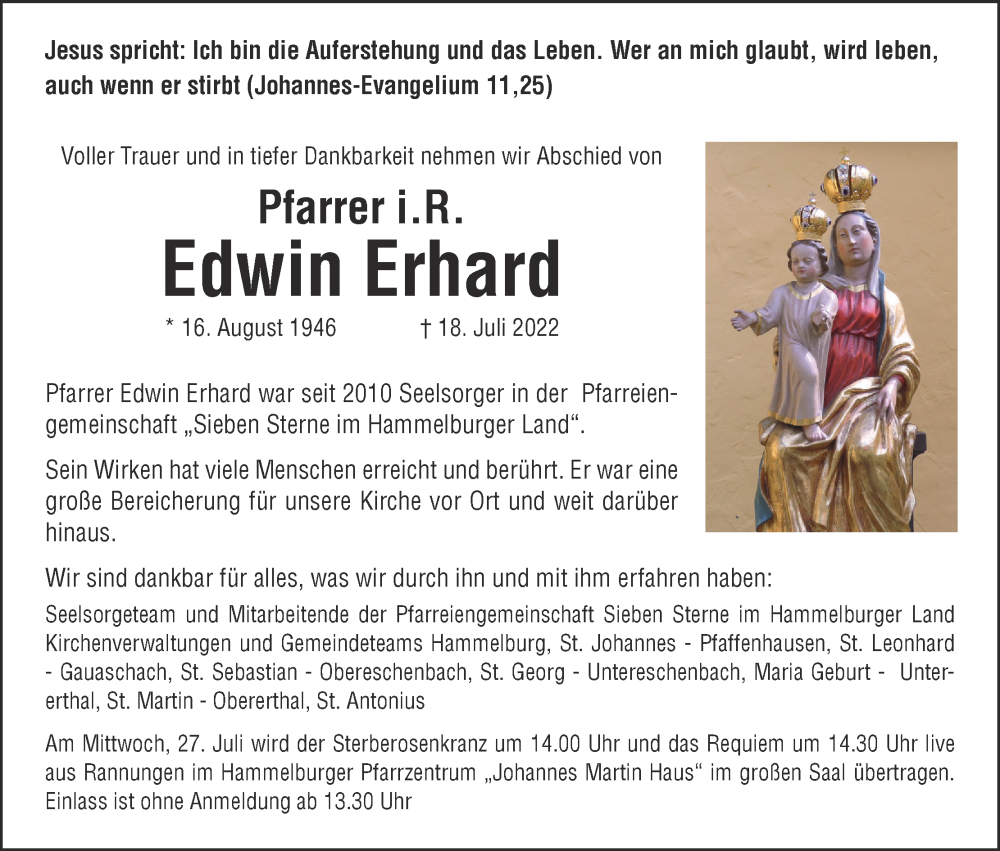 Hier finden Sie alle Traueranzeigen aus der Zeitung, die bisher für Edwin Erhard erschienen sind. Weitere Traueranzeigen, die in der Zeitung erscheinen, werden hier ebenfalls aufgelistet