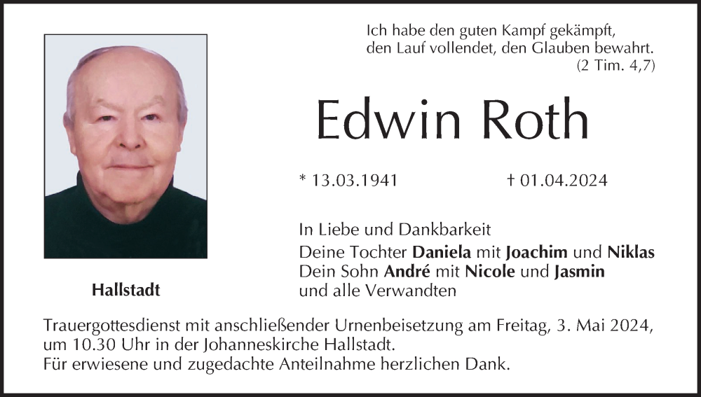 Hier finden Sie alle Traueranzeigen aus der Zeitung, die bisher für Edwin Roth erschienen sind. Weitere Traueranzeigen, die in der Zeitung erscheinen, werden hier ebenfalls aufgelistet