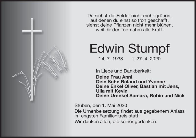 Hier finden Sie alle Traueranzeigen aus der Zeitung, die bisher für Edwin Stumpf erschienen sind. Weitere Traueranzeigen, die in der Zeitung erscheinen, werden hier ebenfalls aufgelistet