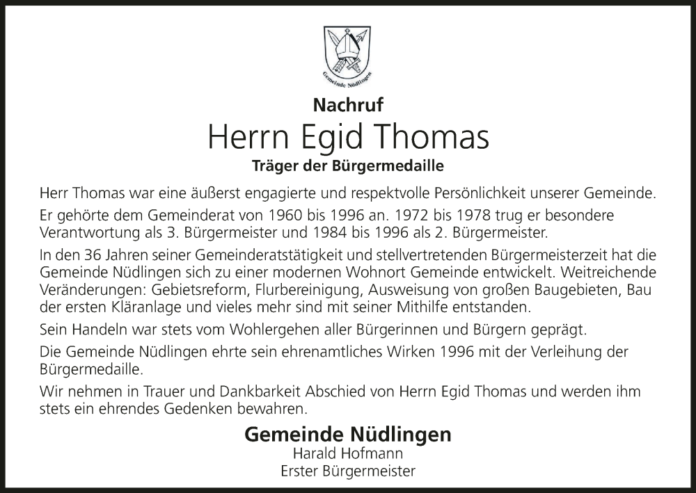 Hier finden Sie alle Traueranzeigen aus der Zeitung, die bisher für Egid Thomas erschienen sind. Weitere Traueranzeigen, die in der Zeitung erscheinen, werden hier ebenfalls aufgelistet