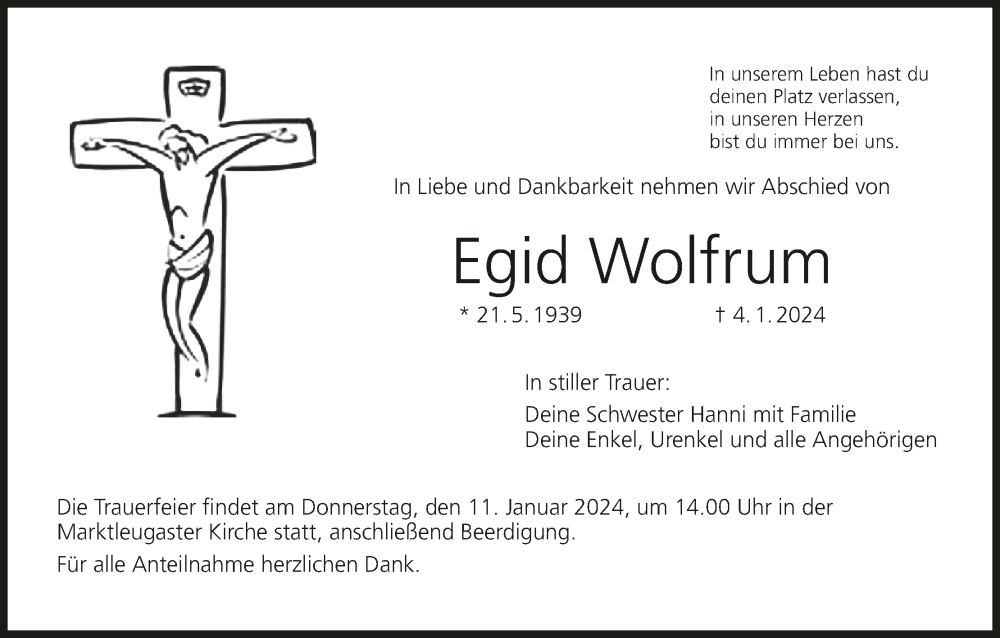 Hier finden Sie alle Traueranzeigen aus der Zeitung, die bisher für Egid Wolfrum erschienen sind. Weitere Traueranzeigen, die in der Zeitung erscheinen, werden hier ebenfalls aufgelistet