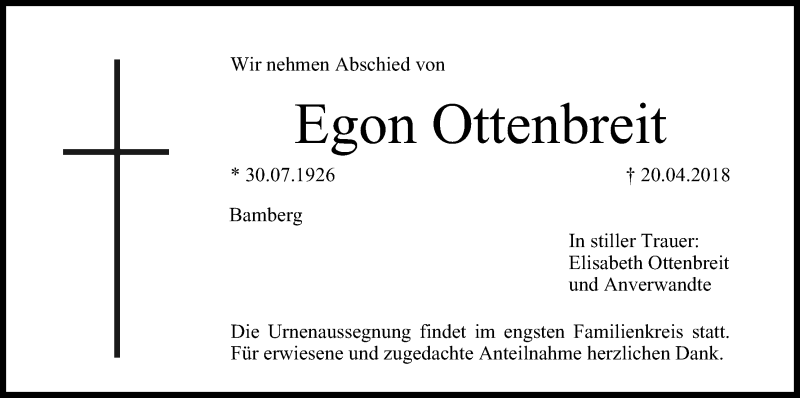 Hier finden Sie alle Traueranzeigen aus der Zeitung, die bisher für Egon Ottenbreit erschienen sind. Weitere Traueranzeigen, die in der Zeitung erscheinen, werden hier ebenfalls aufgelistet