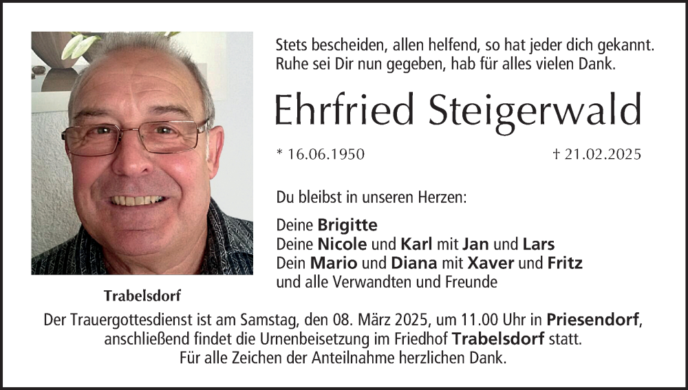 Hier finden Sie alle Traueranzeigen aus der Zeitung, die bisher für Ehrfried Steigerwald erschienen sind. Weitere Traueranzeigen, die in der Zeitung erscheinen, werden hier ebenfalls aufgelistet