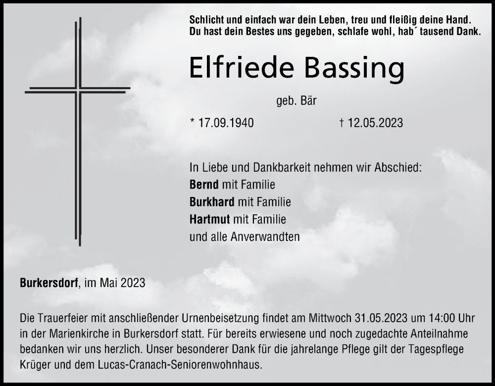 Hier finden Sie alle Traueranzeigen aus der Zeitung, die bisher für Elfriede Bassing erschienen sind. Weitere Traueranzeigen, die in der Zeitung erscheinen, werden hier ebenfalls aufgelistet