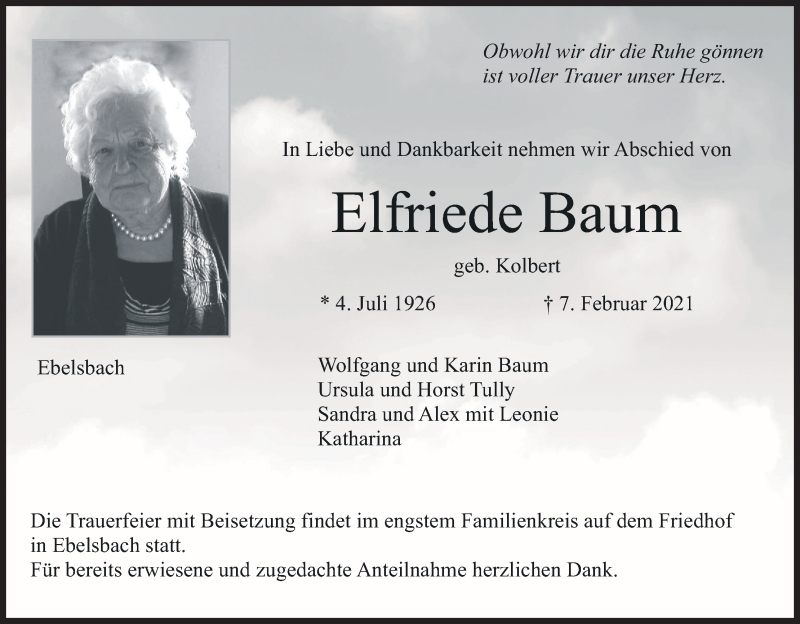 Hier finden Sie alle Traueranzeigen aus der Zeitung, die bisher für Elfriede Baum erschienen sind. Weitere Traueranzeigen, die in der Zeitung erscheinen, werden hier ebenfalls aufgelistet