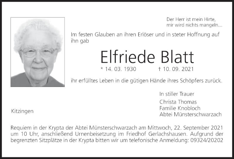 Hier finden Sie alle Traueranzeigen aus der Zeitung, die bisher für Elfriede Blatt erschienen sind. Weitere Traueranzeigen, die in der Zeitung erscheinen, werden hier ebenfalls aufgelistet