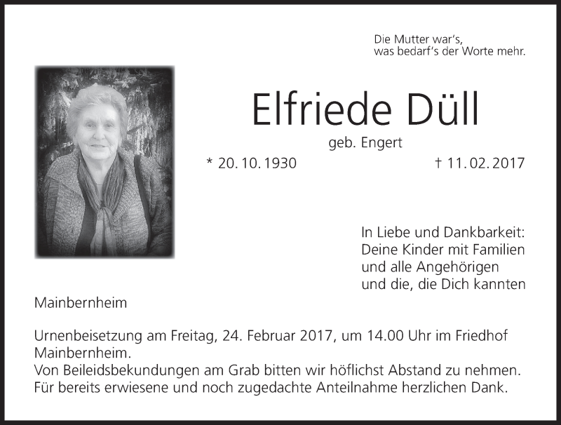 Hier finden Sie alle Traueranzeigen aus der Zeitung, die bisher für Elfriede Düll erschienen sind. Weitere Traueranzeigen, die in der Zeitung erscheinen, werden hier ebenfalls aufgelistet