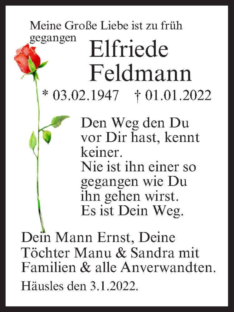Hier finden Sie alle Traueranzeigen aus der Zeitung, die bisher für Elfriede Feldmann erschienen sind. Weitere Traueranzeigen, die in der Zeitung erscheinen, werden hier ebenfalls aufgelistet