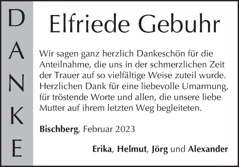 Hier finden Sie alle Traueranzeigen aus der Zeitung, die bisher für Elfriede Gebuhr erschienen sind. Weitere Traueranzeigen, die in der Zeitung erscheinen, werden hier ebenfalls aufgelistet