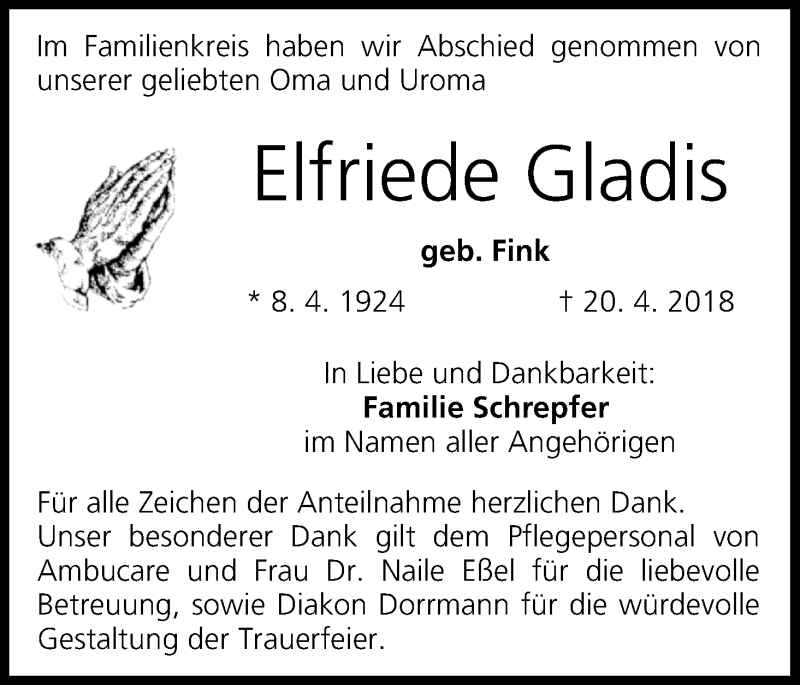 Hier finden Sie alle Traueranzeigen aus der Zeitung, die bisher für Elfriede Gladis erschienen sind. Weitere Traueranzeigen, die in der Zeitung erscheinen, werden hier ebenfalls aufgelistet