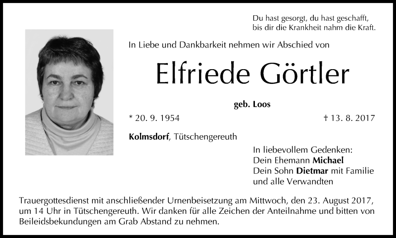Hier finden Sie alle Traueranzeigen aus der Zeitung, die bisher für Elfriede Görtler erschienen sind. Weitere Traueranzeigen, die in der Zeitung erscheinen, werden hier ebenfalls aufgelistet