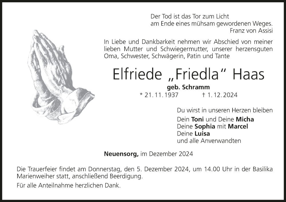 Hier finden Sie alle Traueranzeigen aus der Zeitung, die bisher für Elfriede Haas erschienen sind. Weitere Traueranzeigen, die in der Zeitung erscheinen, werden hier ebenfalls aufgelistet