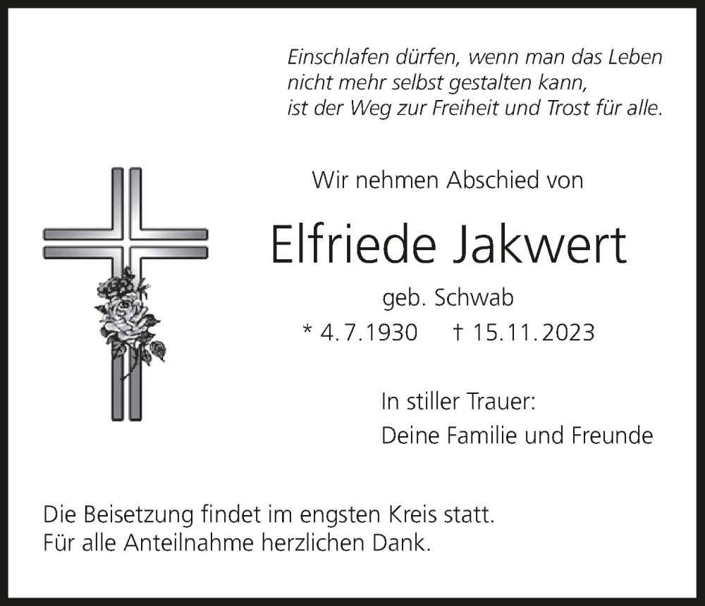 Hier finden Sie alle Traueranzeigen aus der Zeitung, die bisher für Elfriede Jakwert erschienen sind. Weitere Traueranzeigen, die in der Zeitung erscheinen, werden hier ebenfalls aufgelistet