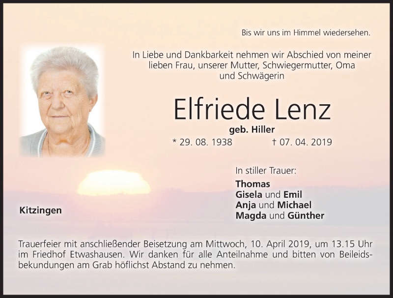 Hier finden Sie alle Traueranzeigen aus der Zeitung, die bisher für Elfriede Lenz erschienen sind. Weitere Traueranzeigen, die in der Zeitung erscheinen, werden hier ebenfalls aufgelistet